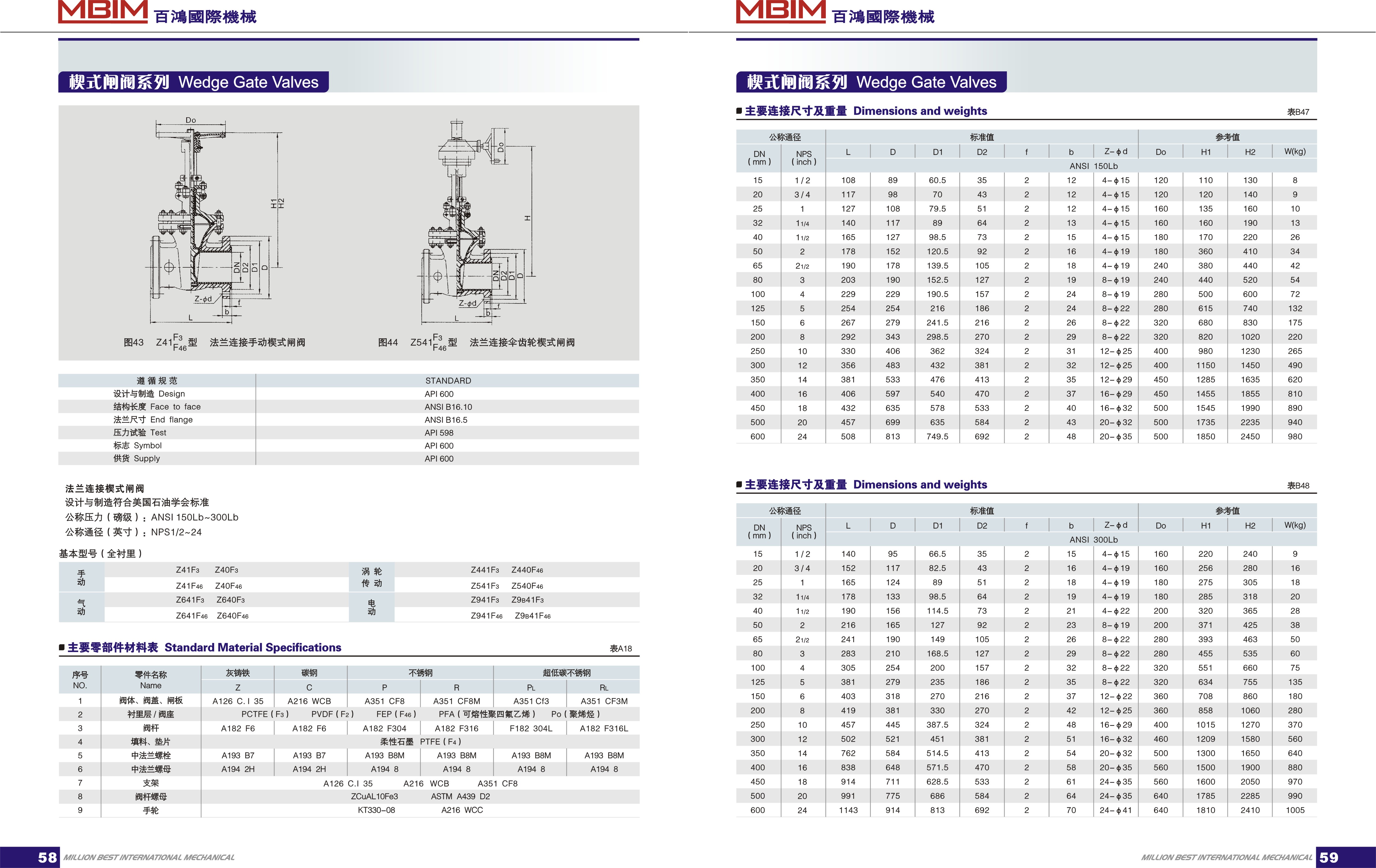 产品说明: 楔式闸阀是一种最常见的启闭阀门,利用两侧密封呈楔状的闸板来接通或截断管理路中介。楔式闸阀不允许微量开启的管路中作节流装置用,以免因高速流动的介质冲蚀而加快密封的损坏。 一、楔式闸阀的特点 1、阀体有扁体和圆体两种形状:GB阀门采用圆体,ANSI磅级阀门DN≤300LB采用扁体,DN≥400LB采用圆体。阀盖的内腔和闸板、阀杆外表面等直接与介质接触的部件,全部包衬FEP(F46)或PCTFE(F3)等氟塑料; 二、基本型号 Z41F3型、Z41F46型和Z40F3、Z40F46型。 三、设计规范 遵循 GB 12234/API600标准。 四、驱动方式 手动、电动、正齿轮、伞齿轮传动。