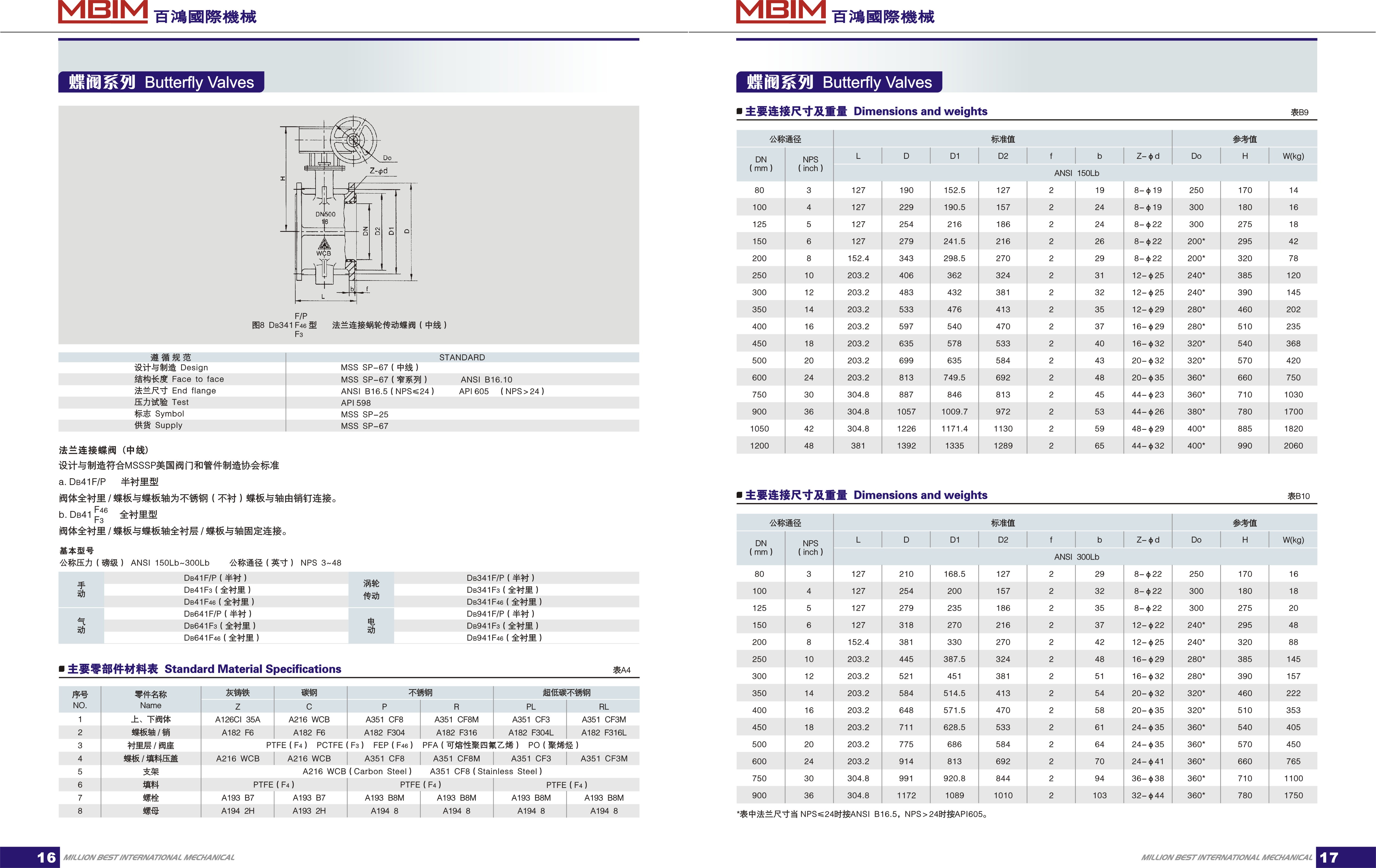 ![]() 产品说明 蝶阀是用随阀杠一起转动的蝶板作启动闭件,用以实现阀门的开启、关闭与调节。 蝶阀在个管路中除了起节断和截流用外。体积小重量轻、结构简单等优点与同参数闸阀比较,平均减轻重量达30-50%,碟板旋转90度,既可实现启、闭过程,又由于转轴两侧碟板受到介质作用近似相等,转矩相反,因此闭启矩较小。 一、公司推出的氟塑料衬里蝶阀系列 1、其基本类型有两种,即D71F4和F46(中线)全衬里型对夹式蝶阀,采用对分两片式阀体组合,阀座与阀体内衬一体化,阀门工作间,只有全塑座与衬塑蝶板于介质接触,产品可承受“除熔融碱金属和元素氟”外的任何介质腐蚀,其中D7146阀杠与碟阀(缎)为一体,表面均匀包覆一层FEP。阀体通道内表面光滑,流体阻国小,CV值高,流通能力强,扭矩适中,采用四级密封结构并在密封面外配以耐温抗老化的SI橡胶的弹性衬阀座,完全达到介质的零泄露。 二、结构特点 1、中线蝶阀为整个蝶板与阀座在360度圆周中心(中线),具有双向密封功能,压力,流量可以只有调节器节; 三、设计规范 遵循 GB 12238,AP1609,MSS SP-67,MSS SP-68标准。 四、驱动方式 手动、涡轮传动、气动、电动。